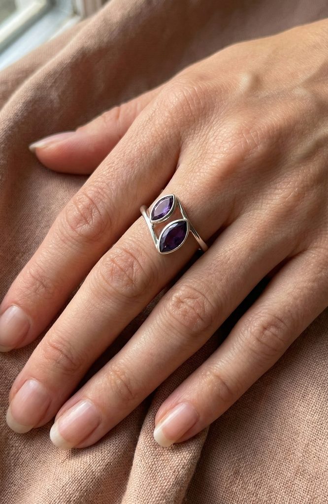 Tento stříbrný prsten s dvojicí ametystů zaujme už na první pohled svou lehkostí, moderní linií a výraznou barevností. Dva fialové kameny v brusu marquise působí jako dvojité světlo – dvě energie, které se vzájemně doplňují a vytvářejí dokonalou rovnováhu. Prsten je ideální pro ženy, které mají rády neobvyklý design, jemný luxus a kameny s hlubším významem.