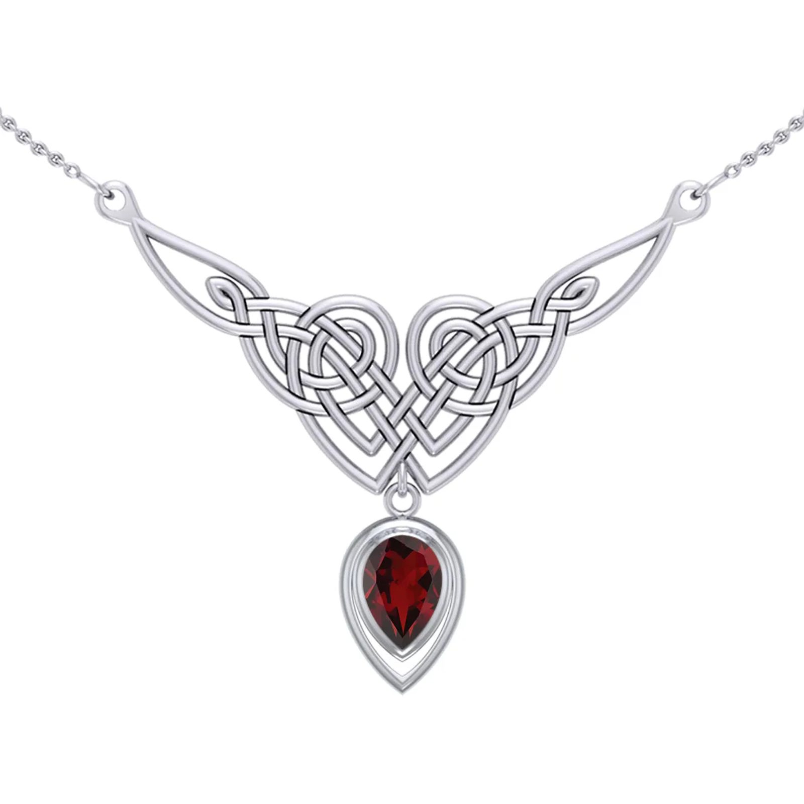 Tento stříbrný náhrdelník Granátové srdce Keltů spojuje starodávnou keltskou symboliku s hlubokou, krvavě červenou září granátu. Propletený motiv dvojitého srdce ze stříbra 925 tvoří výrazný středový prvek, z něhož volně visí broušený granát ve tvaru slzy. Výsledkem je šperk, který působí zároveň romanticky, mysticky i sebevědomě.