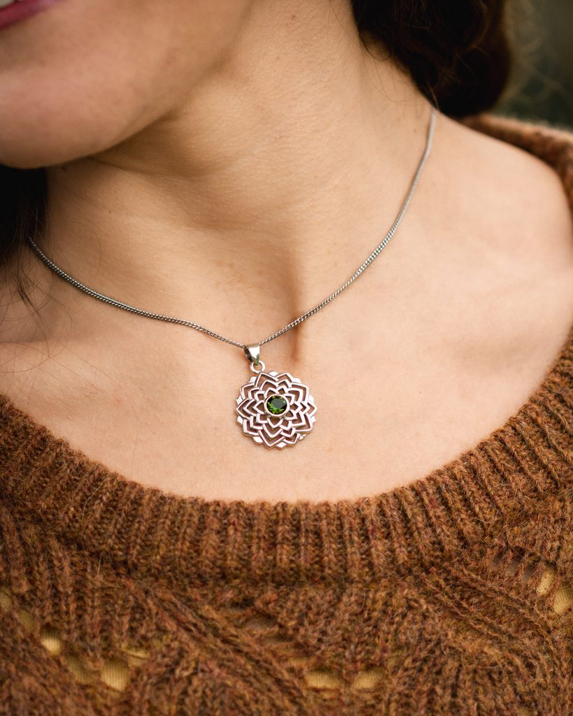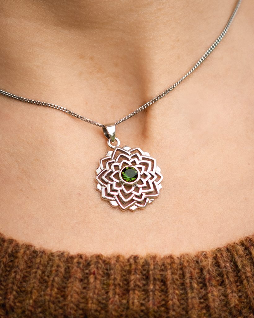 Tento dechberoucí přívěsek je inspirován Sahasrárou – sedmou korunní čakrou, která symbolizuje osvícení, propojení s vesmírem a duchovní svobodu. Její tisíce okvětních lístků tvoří květ kosmického vědomí, jehož středem září český vltavín – kámen zrozený z nebeského ohně.