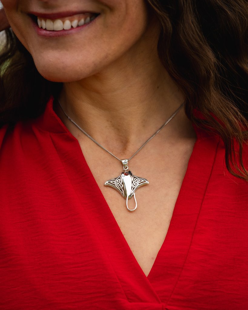 Manta, stříbrný talisman inspirovaný světem fantasy, je skvostným klenotem plným elegance a tajemství. Tento velký závěs, vyrobený z kvalitního stříbra 925, je zdoben vzácným granátem, který dodává tomuto šperku jedinečný vzhled a hloubku.