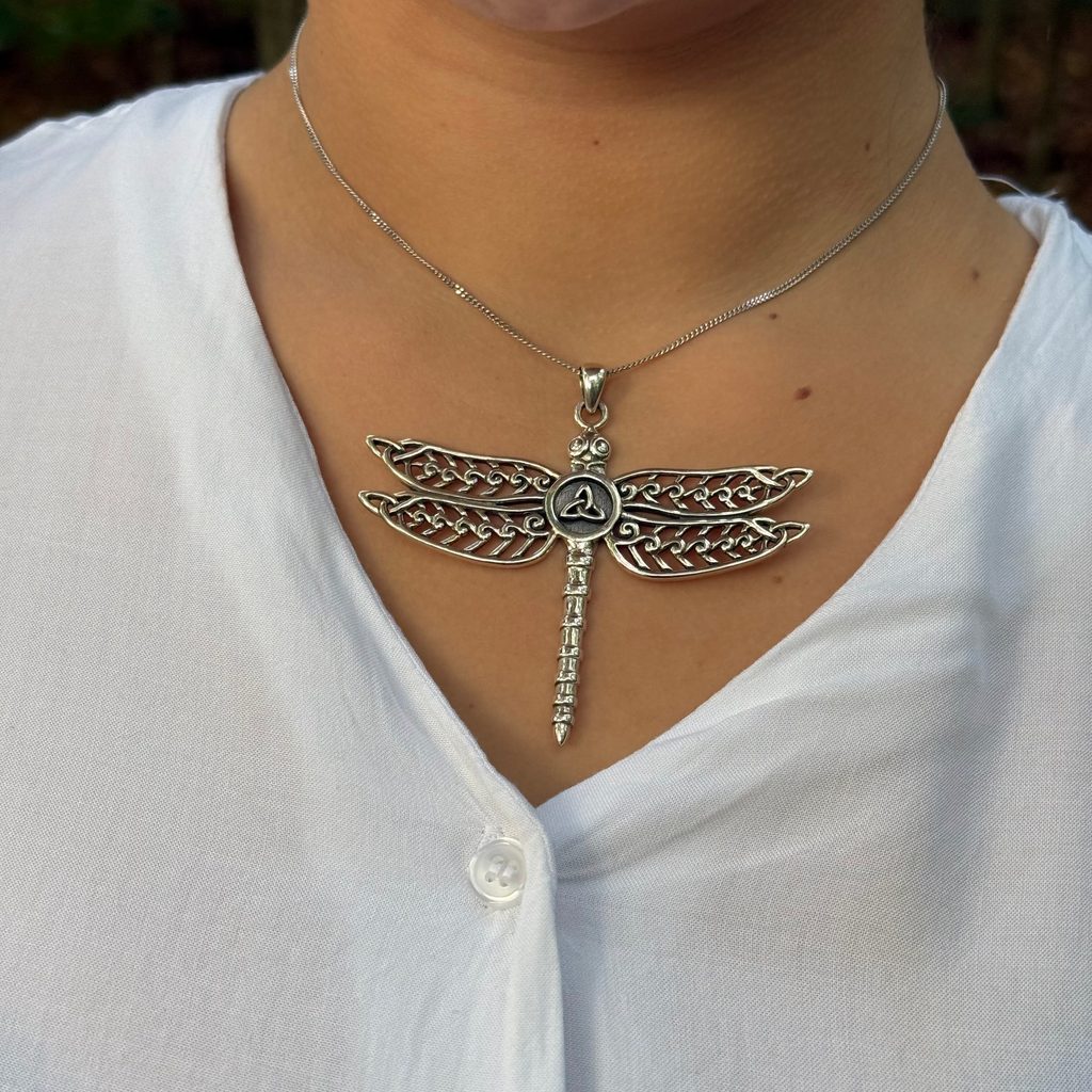 Trinity Knot (trojitý uzel) je symbol nekonečna a spojení mezi třemi elementy – tělem, myslí a duší. Společně s vážkou vytváří šperk s hlubokým duchovním významem.