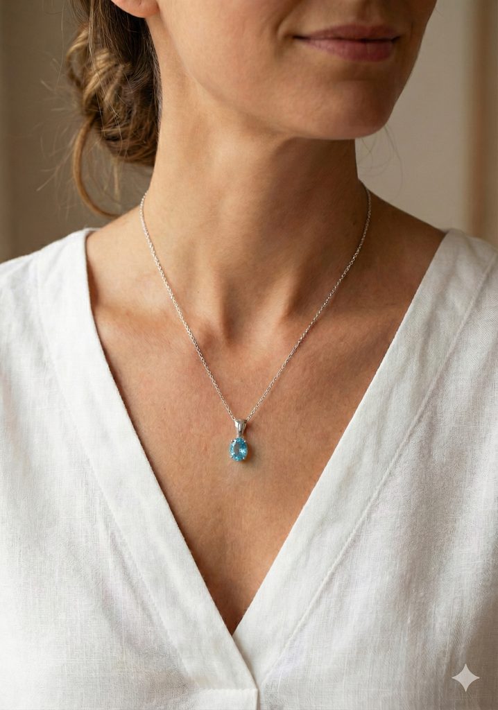 Modrý topaz je spojován s klidem, komunikací a upřímností. Pomáhá zklidňovat mysl, podporuje jasné myšlenky a harmonické vztahy. Díky své nebesky modré barvě působí velmi svěže a snadno se kombinuje jak s každodenním oblečením, tak se slavnostnějšími šaty.