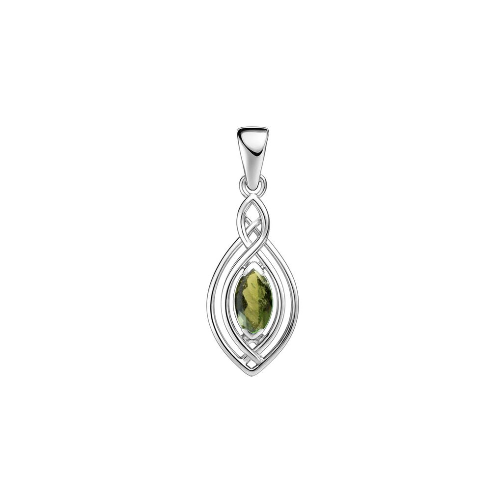 V srdci přívěsku září pravý vltavín broušený do elegantního tvaru marquise (kopí). Tento výbrus podtrhuje jeho jedinečnou zeleň a dodává šperku dynamiku i vznešenost. Vltavín je kamenem duchovní transformace a hlubokého propojení se Zemí. Vznikl při dopadu meteoritu a nese v sobě sílu hvězd.