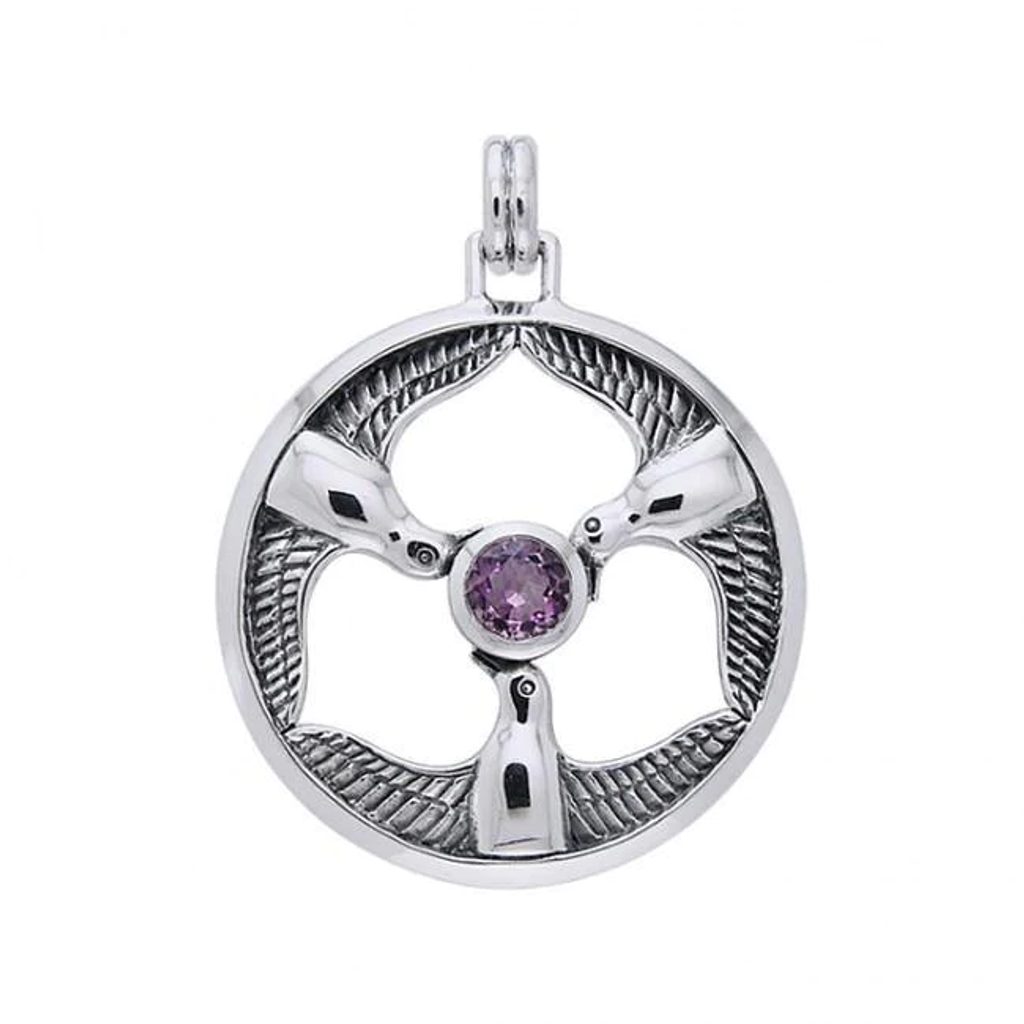 Tři ptáci bohyně Rhiannon, inspirovaní starověkou velšskou mytologií, jsou vytesáni do tohoto masivního stříbrného přívěšku a zdobeni krásným ametystem. Tento jedinečný klenot, vyrobený z kvalitního stříbra 925, přináší harmonii starověkého umění a moderního designu. Je to šperk, který potěší každého milovníka mystiky a fantasy.