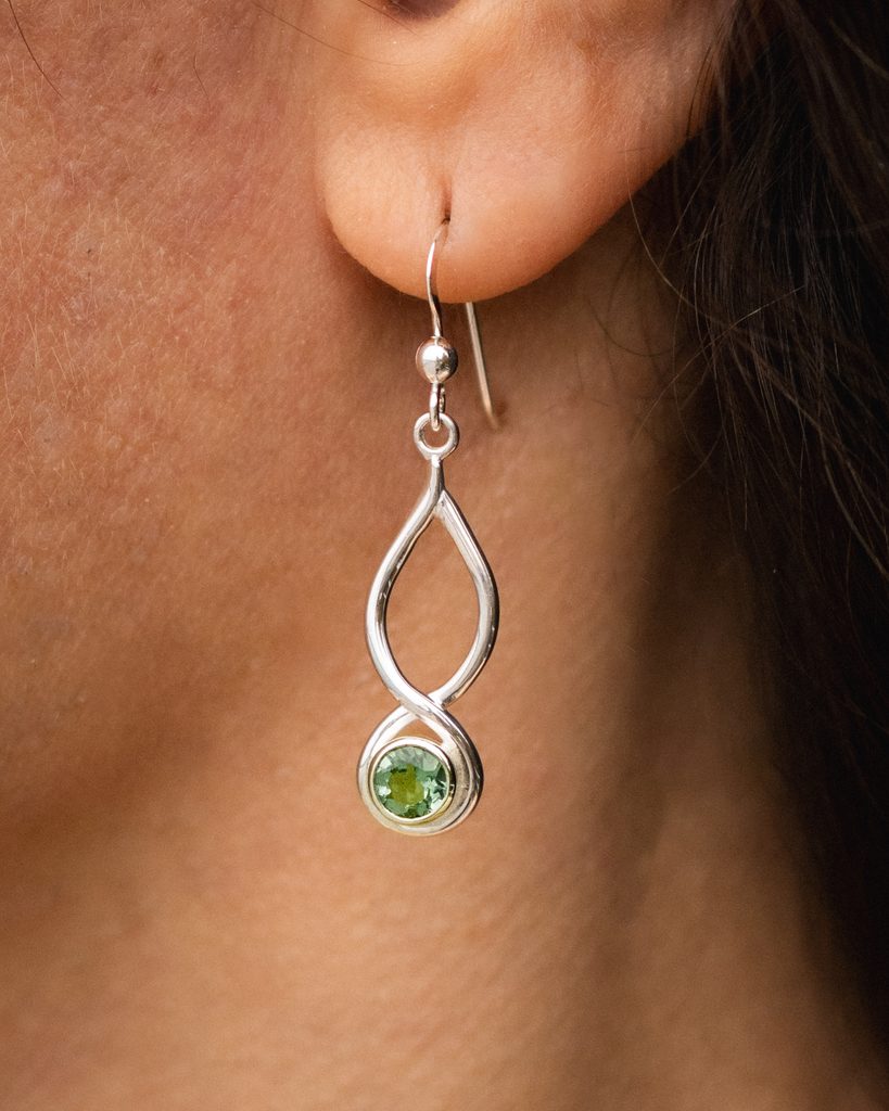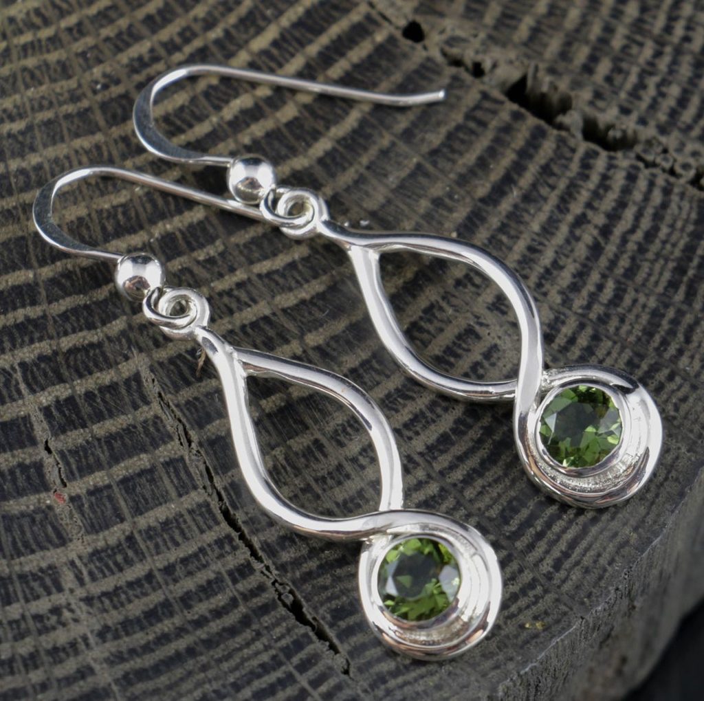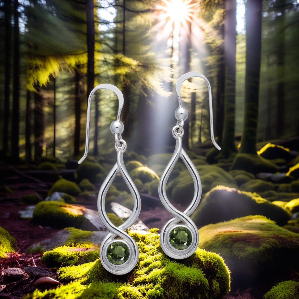 Vltavín – drahokam s hvězdným původem: Vltavín vznikl při dopadu meteoritu na území dnešní České republiky před 15 miliony let. Je symbolem transformace, duchovní síly a propojení s vyššími energiemi. Broušený vltavín v těchto náušnicích září jako zelené srdce spirály – jako světlo uprostřed pohybu.