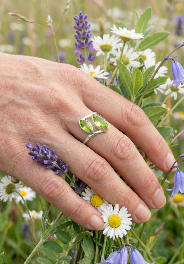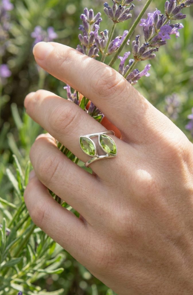 Proč si vybrat tento prsten – výrazný, ale stále elegantní design – dva olivíny v broušení marquise – univerzální šperk vhodný pro každodenní nošení – nádherný symbol propojení a harmonie
