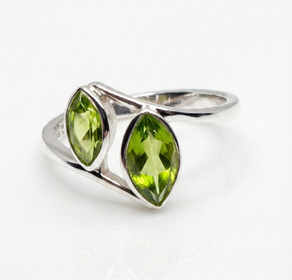 Detaily produktu – materiál: stříbro 925/1000 – kámen: přírodní olivín – velikost většího olivínu: 5 × 10 mm – tvar kamenů: marquise – typ prstenu: otevřený dvoukamenový design