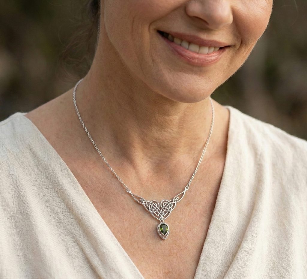Zelené srdce Keltů – stříbrný keltský náhrdelník s pravým vltavínem Talisman propojení s přírodou, duchovní sílou a dědictvím Keltů